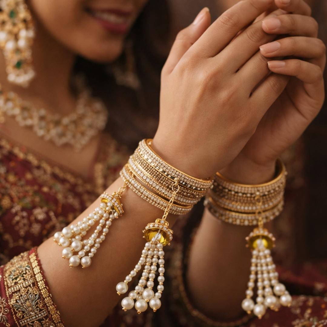 Luxury Gold Plated Pearl Tassel Bridal Bangles Set for Women